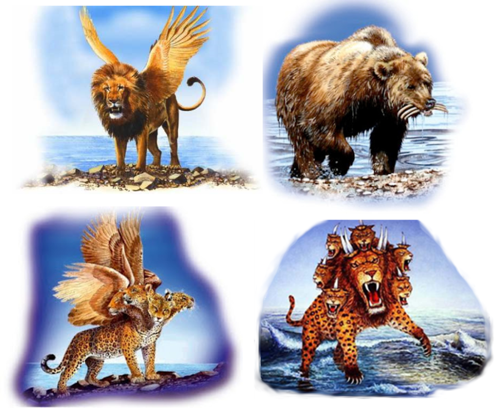 “No primeiro ano de Belsazar, rei de Babilônia, teve Daniel um sonho e visões da sua cabeça quando estava na sua cama; escreveu logo o sonho, e relatou a suma das coisas. Falou Daniel, e disse: Eu estava olhando na minha visão da noite, e eis que os quatro ventos do céu agitavam o mar grande. E quatro animais grandes, diferentes uns dos outros, subiam do mar.  O primeiro era como leão, e tinha asas de águia; enquanto eu olhava, foram-lhe arrancadas as asas, e foi levantado da terra, e posto em pé como um homem, e foi-lhe dado um coração de homem. Continuei olhando, e eis aqui o segundo animal, semelhante a um urso, o qual se levantou de um lado, tendo na boca três costelas entre os seus dentes; e foi-lhe dito assim: Levanta-te, devora muita carne. Depois disto, eu continuei olhando, e eis aqui outro, semelhante a um leopardo, e tinha quatro asas de ave nas suas costas; tinha também este animal quatro cabeças, e foi-lhe dado domínio. Depois disto eu continuei olhando nas visões da noite, e eis aqui o quarto animal, terrível e espantoso, e muito forte, o qual tinha dentes grandes de ferro; ele devorava e fazia em pedaços, e pisava aos pés o que sobejava; era diferente de todos os animais que apareceram antes dele, e tinha dez chifres”.