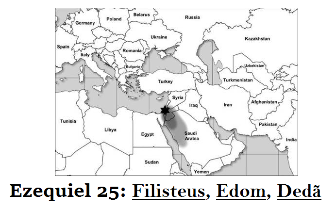 A causa desse julgamento novamente é a forma como Edom trata “a casa de Judá”. Além de Edom temos também a região de Dedã (norte da atual Arábia Saudita), Temã (onde atualmente é a Jordânia), filisteus e quereteus (povos que ficavam onde atualmente é a faixa de Gaza). Então, de acordo com o texto o julgamento de Deus se dará contra a região que se estende do que atualmente é o a Faixa de Gaza, do atual Sul da Jordânia até o atual centro-norte da Arábia Saudita, conforme a região assinalada: