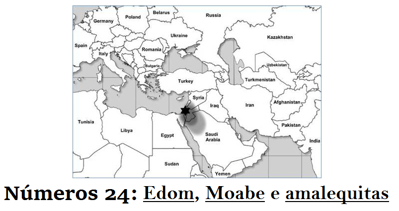 Perceba que há povos e regiões citados nessa profecia: Moabe, Edom, Seir, os filhos de Sete, os amalequitas. Onde encontrava-se esse povo e suas terras? Onde se dará essa ação do Messias contra os inimigos de Israel? Todos esses termos referem-se aos povos comumente encontrados em regiões de deserto que viviam a leste de Israel, conforme a área assinalada: