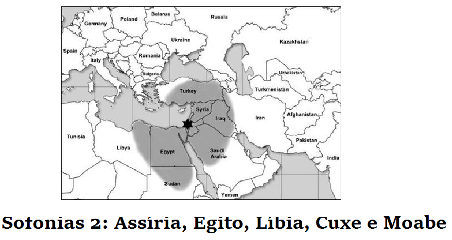 Novamente temos regiões que são vizinhas de Israel e que serão julgadas por Deus. Várias passagens proféticas falam de uma confederação de nações inimigas de Israel que irá invadir o país e cercar Jerusalém. A profecia além de falar da faixa de Gaza e dos palestinos, em Sofonias 2:8-9 e 12-13 fala também de Moabe (a famosa cidade de Petra fica dentro dessa região), Amon (região da Jordânia), Etiópia (no hebraico Cuxe, região da moderna República do Sudão do Norte), bem como a Assíria (que na época englobava áreas que hoje pertencem à Síria, Turquia, Líbano e Iraque) e Nínive (região da cidade de Mossul, no norte do Iraque), conforme podemos ver no mapa abaixo:
